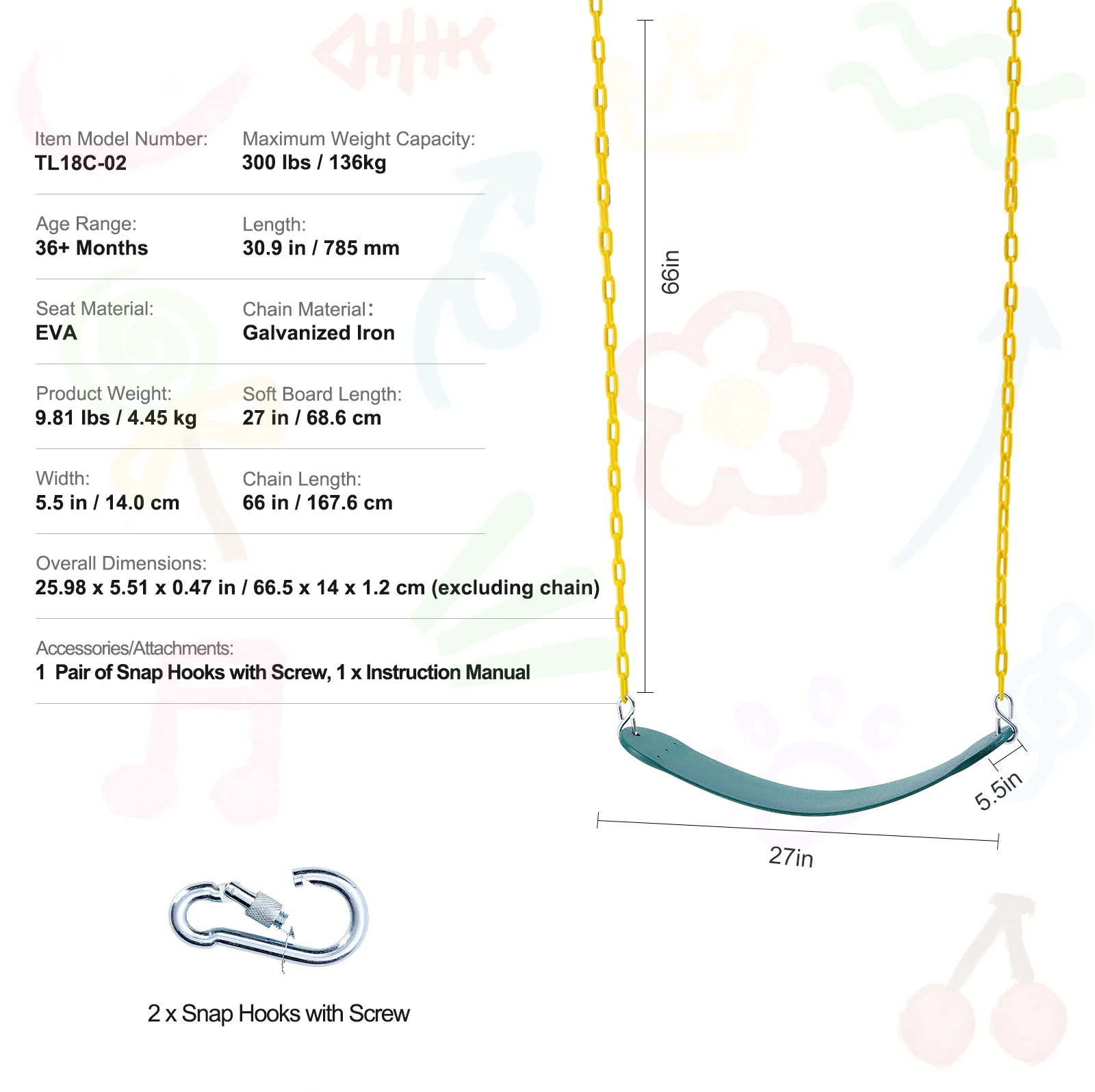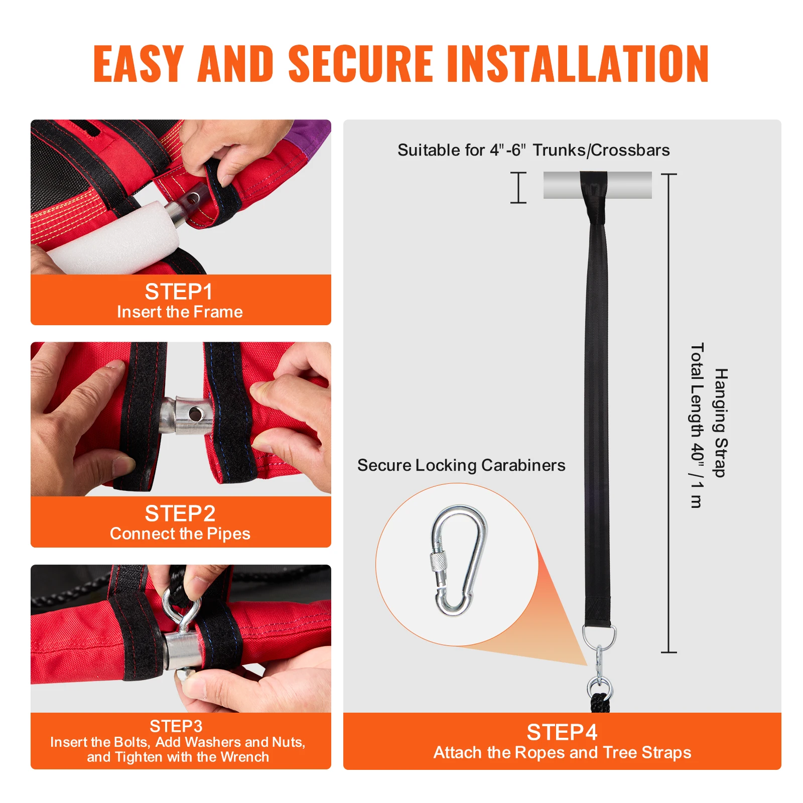 - 900D Multicolor Oxford Fabric: The rainbow-colored swing seat is made of 900D high-density nylon fabric. This durable material is strong and can withstand everyday use and outdoor wear and tear, offering a long lifespan without fading. The frame tubes are made of galvanized steel with a soft foam layer, ensuring comfort and safety for children. The saucer swing seat is secured with four evenly stressed galvanized steel bolts that resist rust and keep the swing stable.